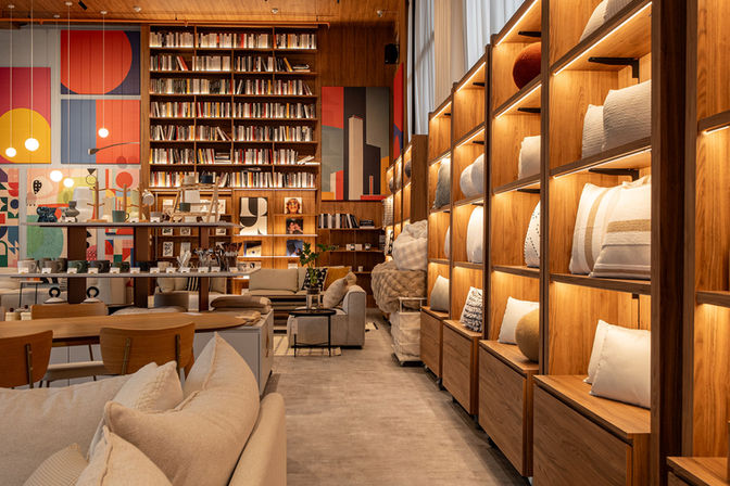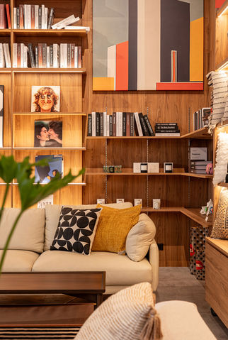 整面木質書牆在空間中穿插調和比例,讓人踏進門市就能感受到被包覆的溫暖。